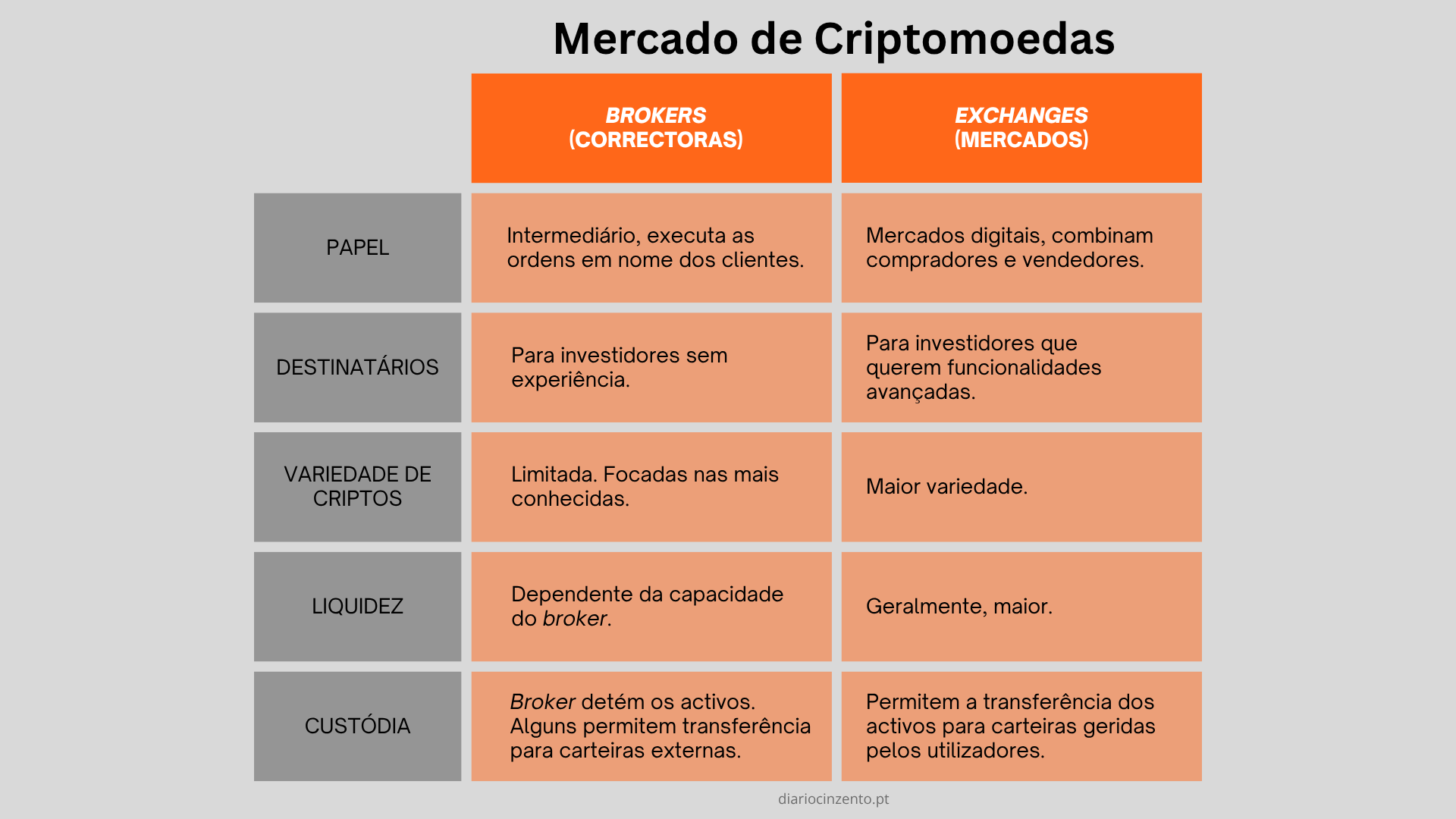 No caso do mercado dos cripto activos, tanto podemos recorrer a brokers como aos próprios mercados centralizados (através das exchanges mencionadas em cima ou outras) ou através dos mercados descentralizados (tema que ficará para um próximo artigo).