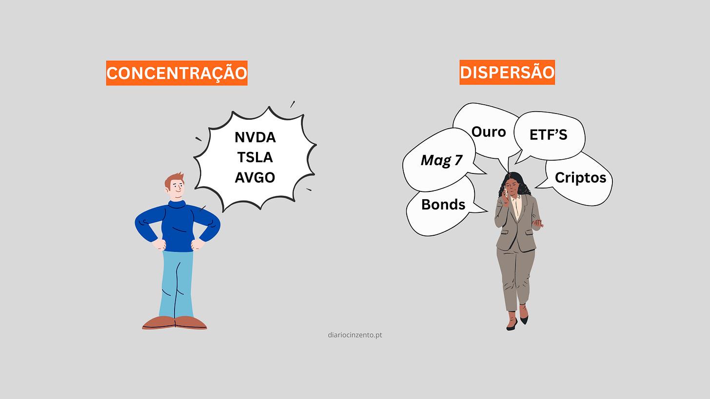Temos aqui 2 casos, que podemos considerar como 2 extremos. Por um lado, o João e a Concentração dos seus investimentos num só sector. Por outro lado, a Maria e aquilo que poderia ser a Diversificação - mas que, considerando o descrito, se enquadra mais na Dispersão.