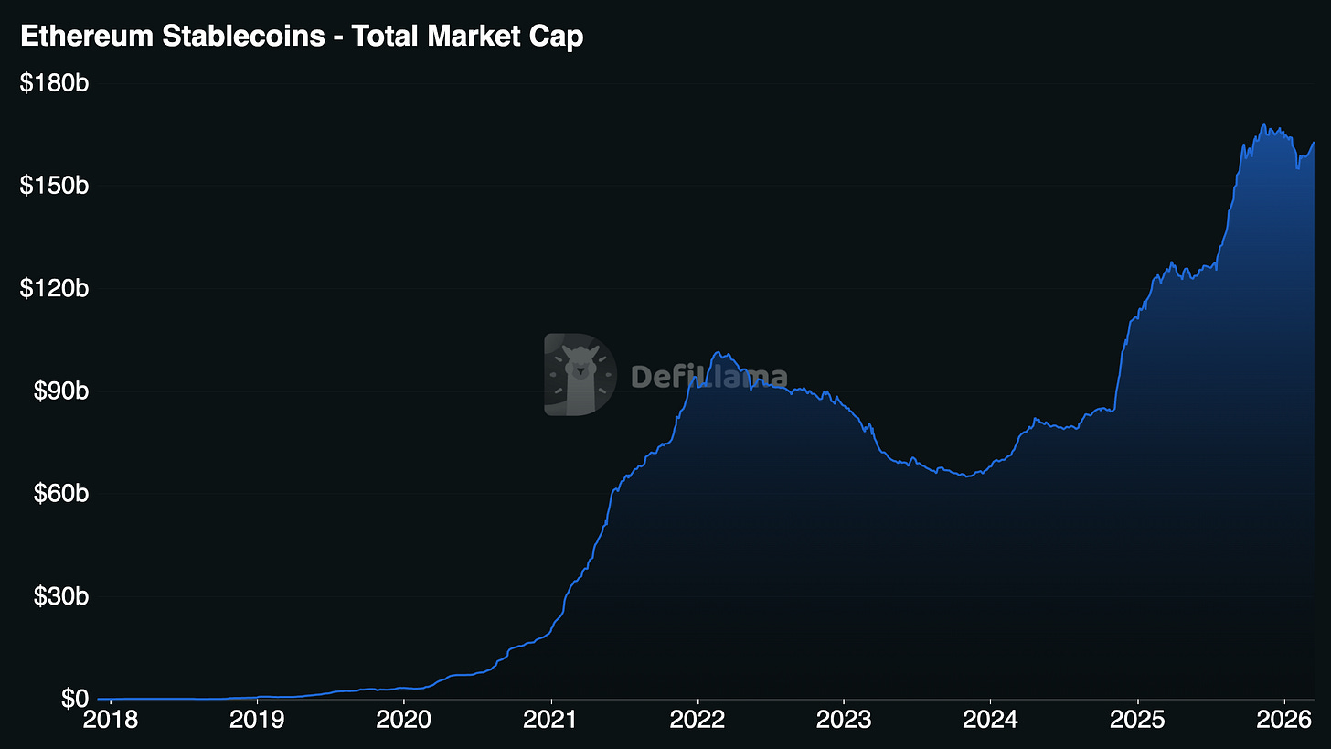 Segundo o DefiLlama, só na rede da Ethereum, o market cap das stablecoins, ronda os $162 biliões.