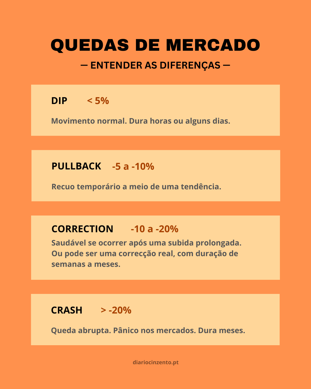 Drawdowns, dips, pullbacks, corrections, crashes são frequentemente usados. Por vezes há quem os misture mas, na realidade, significam coisas diferentes: