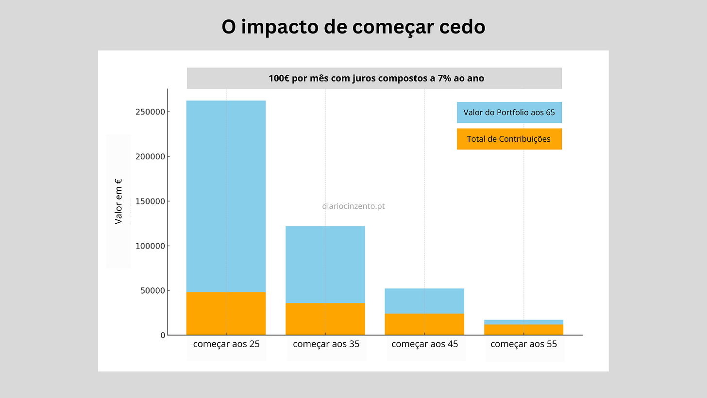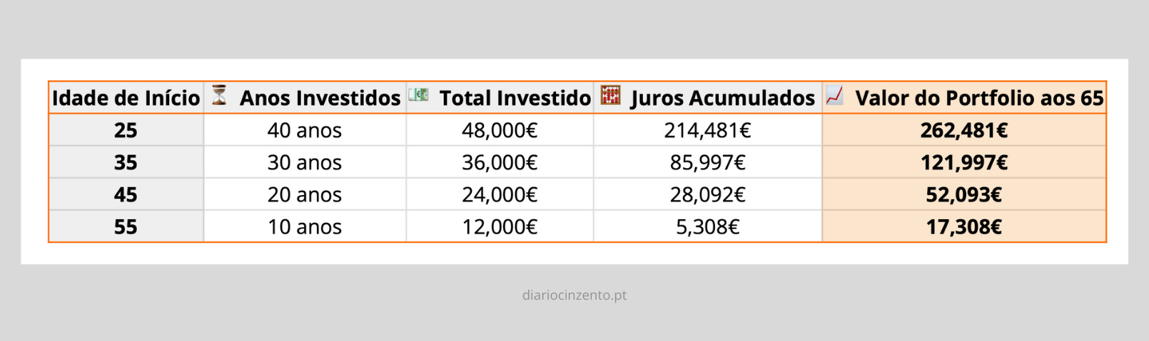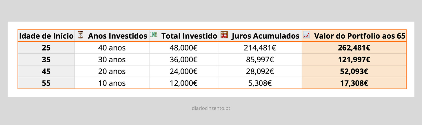 no entanto, quem começou aos 25, quando chegou aos 35, já tinha acumulado cerca de 5300€ em juros, enquanto que outros ainda estavam a começar;