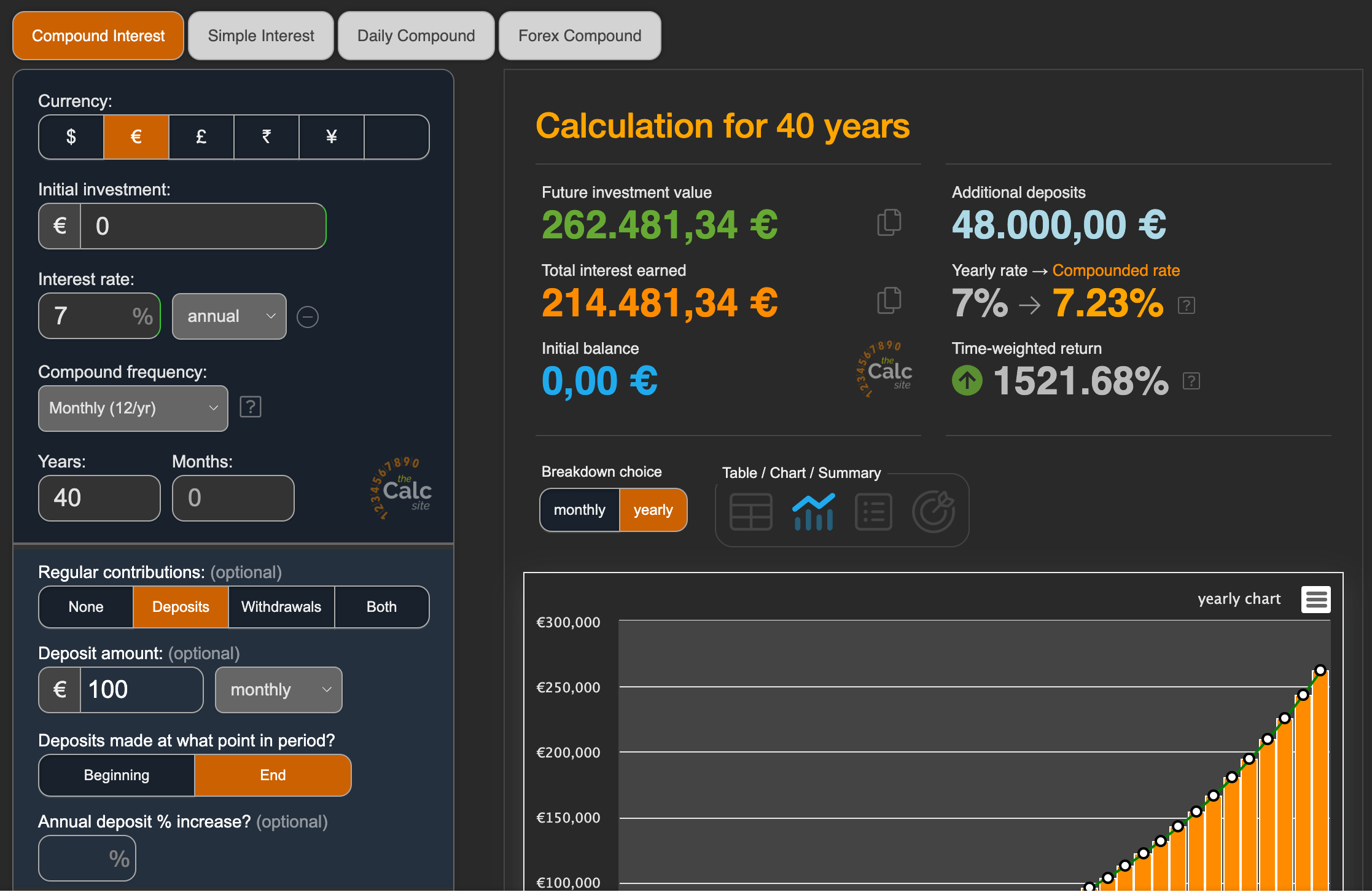 Para o exercício deste artigo, foi usada esta calculadora com juros compostos, gratuita, com estes dados: